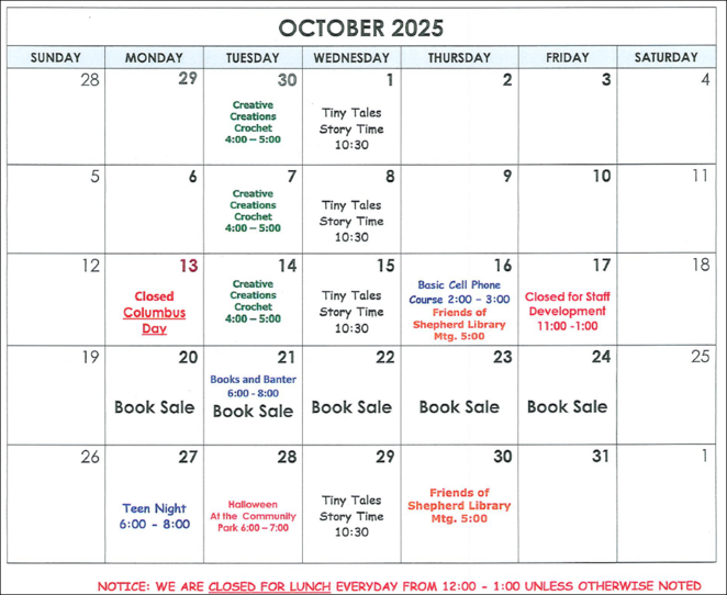 Shepherd Library is open Monday through Friday 8 am - 5 pm - Closed 12 - 1 for lunch