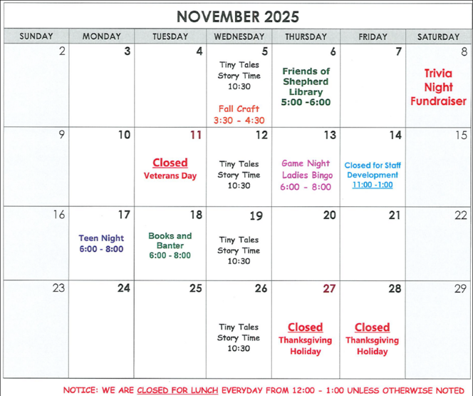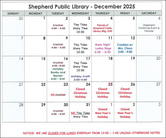 Shepherd Library is open Monday through Friday 8 am - 5 pm - Closed 12 - 1 for lunch